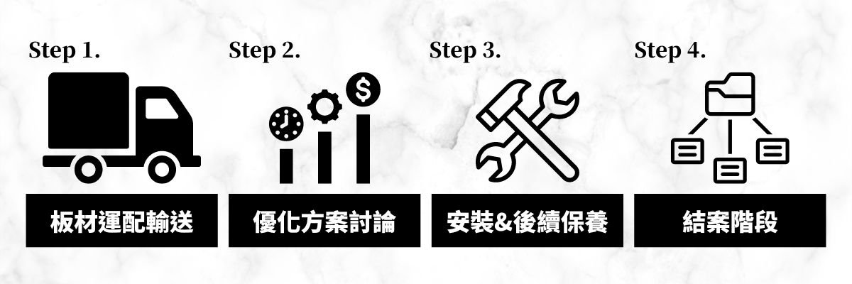 我們會為您規劃詳細的運輸資訊表,先確定案場運輸條件後約定時間場勘,回饋案場是否有特殊狀況會造成板材運輸困難,再核對進料日期與運輸廠商聯絡資訊,讓您一表在手,清楚明瞭!
